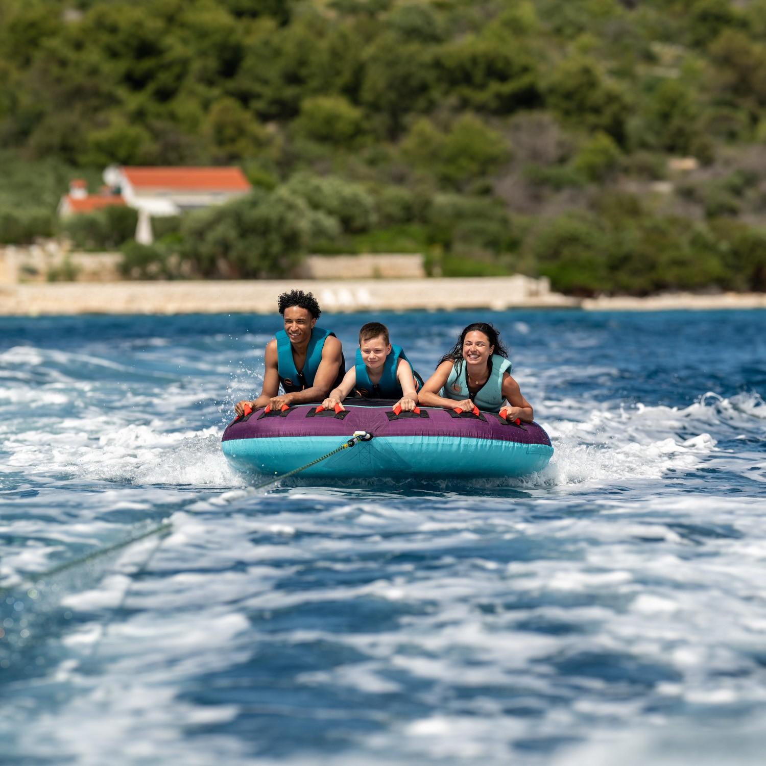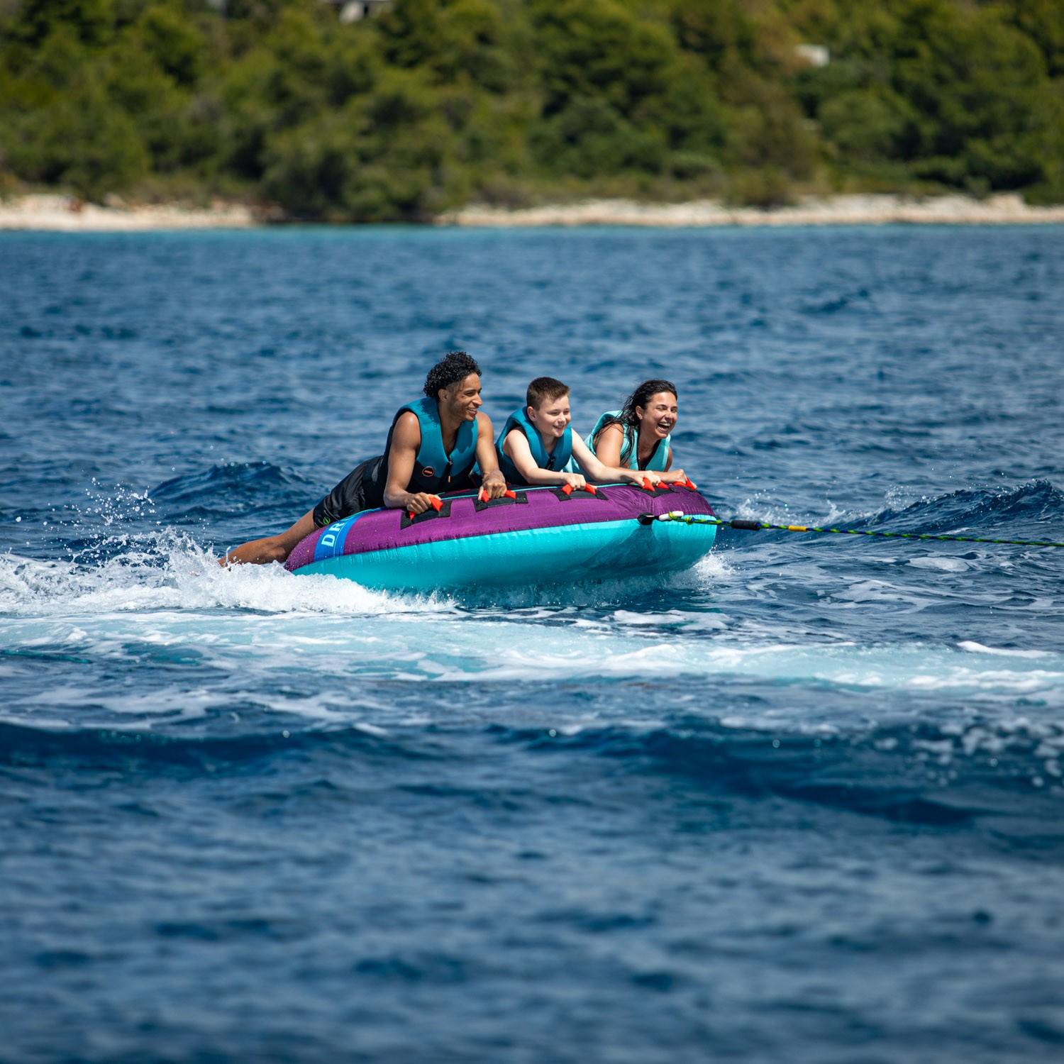 El arrastrable Droplet 3P de Jobe es la mezcla perfecta entre diversión y adrenalina en el agua. Con capacidad para tres personas, está diseñado para que te subas con tus amigos y vivan una experiencia sacachucha detrás de la lancha: giros, rebotes y velocidad que no te dejarán de hacer reír.